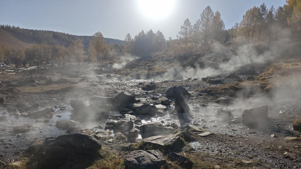 С подъёмом и спуском на 400 метров по вертикали. Уже на подходе. Искомому месту увидели толпу людей и не менее 30 машин на парковке источника. Оказалось, это был корпоратив, который организовался из Хорхорина на выходные.