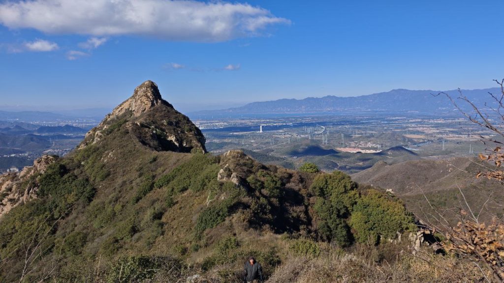 Рабочие ходили по тропе туда-сюда, занося брёвнышки, которыми они потом выстилали тропу, ведущую к вершине. В точке 40.371912, 116.00011 тропа стала уже не такой заметной, и начался крутой подъём на гребень. Через 40 минут я оказался на вершине горы Тао Шань. Незабываемая панорама предстала перед моим взором.