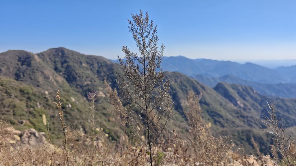 Далее я спустился метров на 50 на северный склон горы и пошёл на восток. Там вдалеке, примерно в 1 км по прямой видимости открывалась рыжая полуразрушенная стена. Точнее, её фрагмент. В этом направлении по гребню, поднимаясь и спускаясь, двигался целый час.
