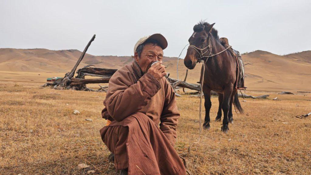 До вечера куролесили с бесшабашной группой офисных работников. В начале пути заехали на обед в рандомно попавшуюся на дороге юрту, где наелись от пуза монгольского супа. Он представляет собой домашнюю нарезанную лапшу с кусочками баранины и бульоном. А Люба, как травоядная, лакомилась сладкой пенкой из молока.