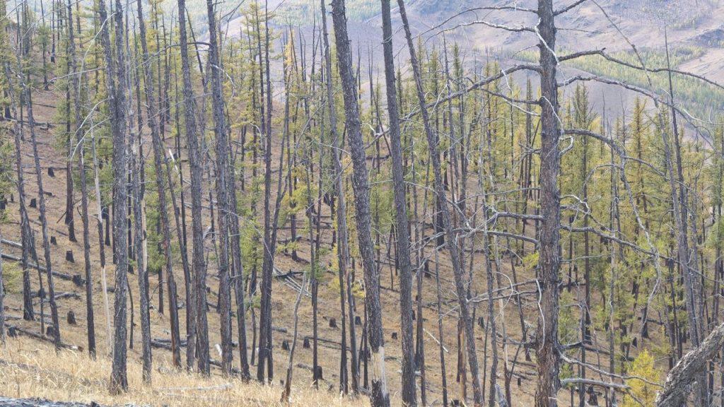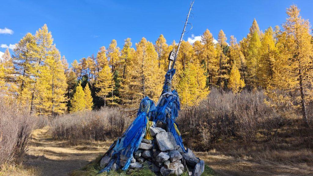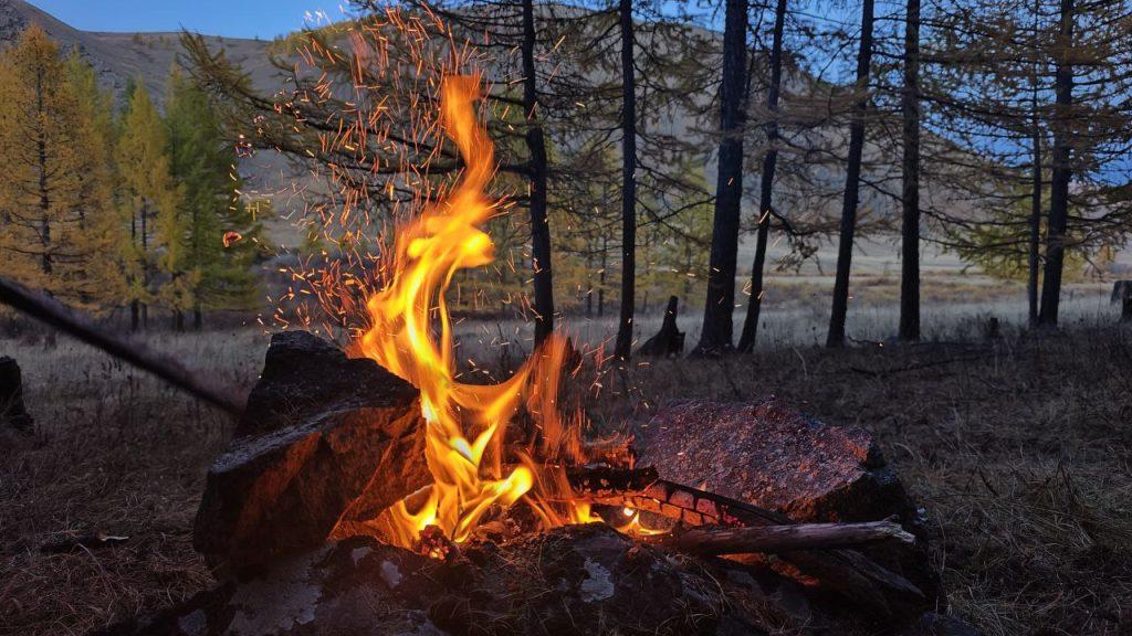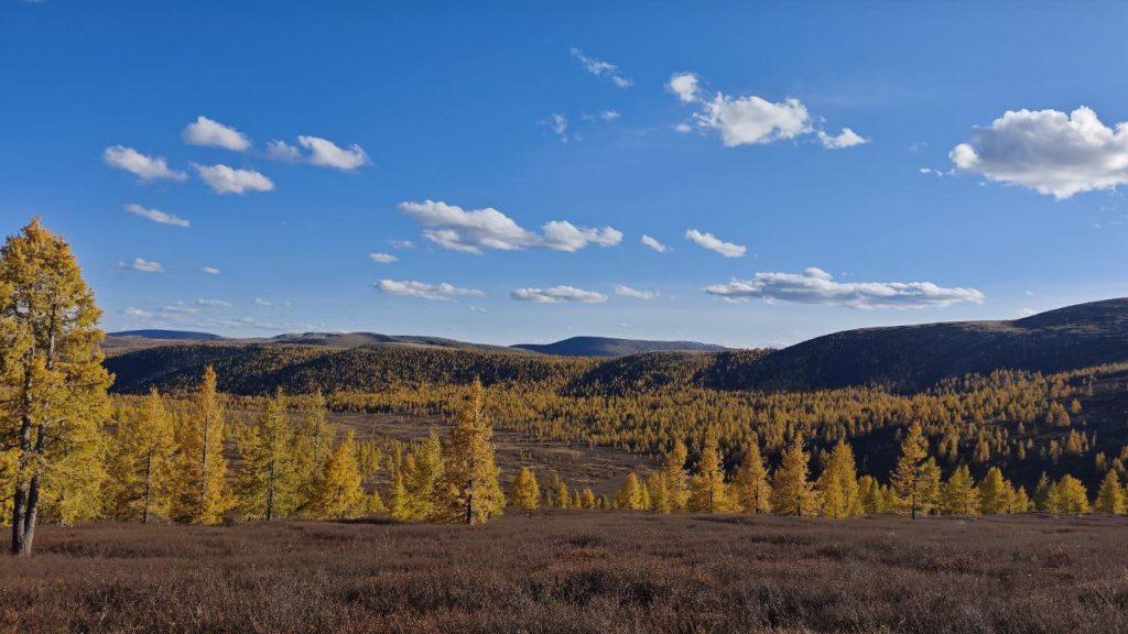 А затем начали спуск по долине, залитой золотом осенних лиственниц. И покидать её мы не хотели, поэтому вылезли из нашей доброй машины и остались в лесу у ручья с кристально чистой водой. Развели костёр и вновь погрузились в первозданную чистоту и красоту природы.