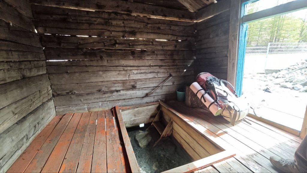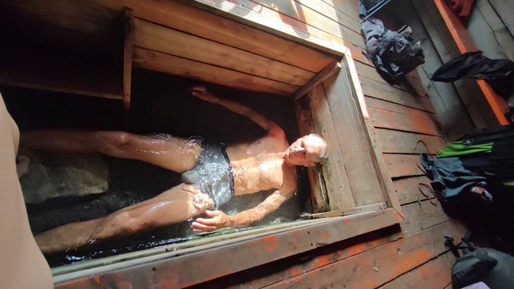 Рюкзаки так же забрали с собой в этот домик. Так как между досками купели были огромные щели, то набрать воду выше уровня первой доски было просто невозможно, а поэтому наши тела еле покрывались горячей водой. Температура её – по ощущениям – около 45 градусов.