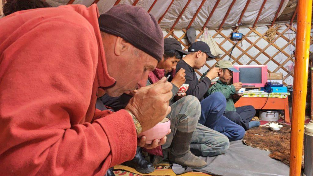 Сторона горы, на которую мы вышли, оказалась более пологой и покрытой лесом, а спуск был приятным и непринуждённым. И когда мы достигли дна долины, увидели две юрты, расположенные на берегу небольшой речушки. Монголы не заставили себя долго ждать и уже вскоре мы получили приглашение на ужин в их жилище.
